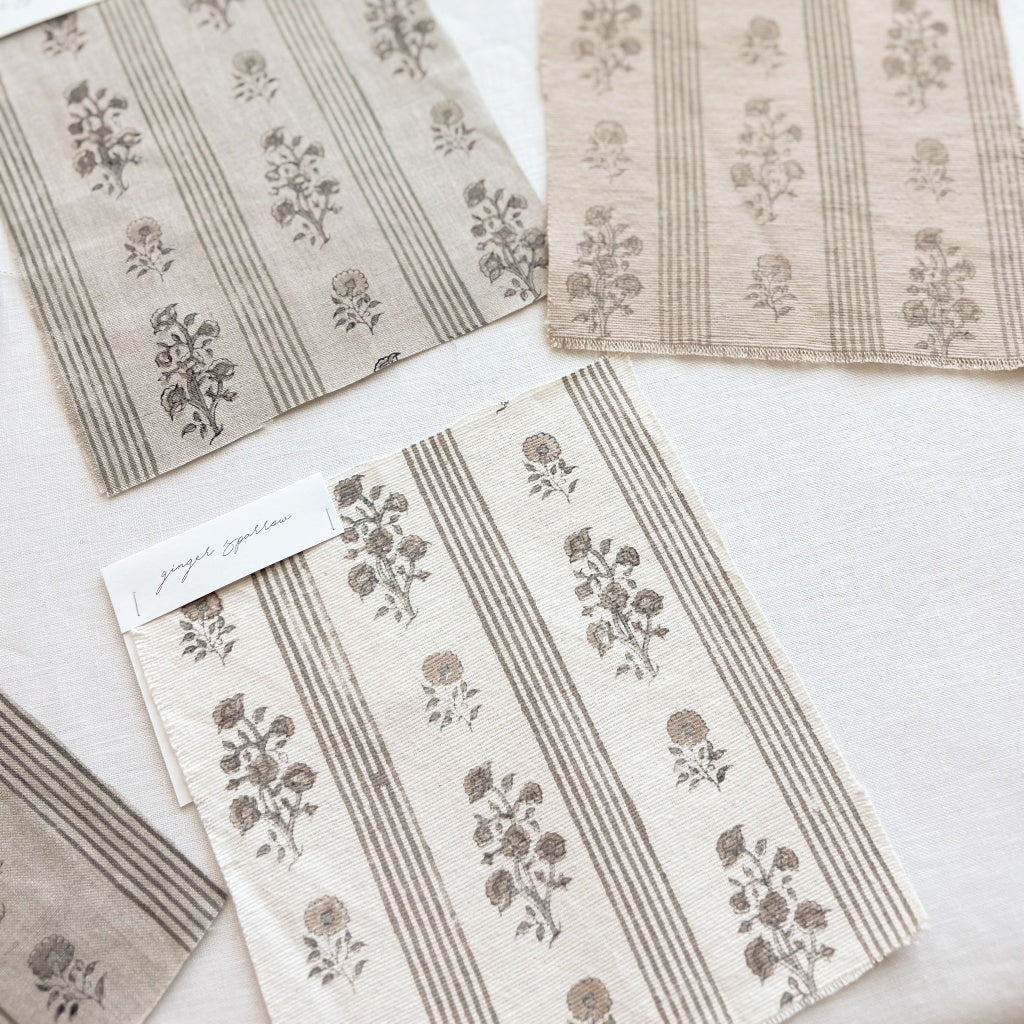 Featuring a delicate floral stripe motif pattern hand block printed using traditional printing techniques, we love the soft color and texture that gives this fabric so much character. Made using incredibly soft linen, it is a bit of modern, a bit of boho, and loads of warmth. We’re dreaming of these for farmhouse-style spaces filled with light and greenery.