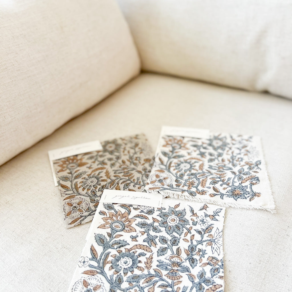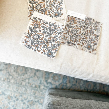 Featuring a delicate floral motif pattern hand block printed using traditional printing techniques, we love the soft color and texture that gives this fabric so much character. Made using incredibly soft linen, it is a bit of modern, a bit of boho, and loads of warmth. We’re dreaming of these for farmhouse-style spaces filled with light and greenery.