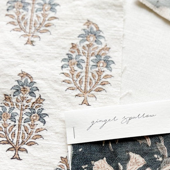 Featuring a delicate floral motif pattern hand block printed using traditional printing techniques, we love the soft color and texture that gives this fabric so much character. Made using incredibly soft linen, it is a bit of modern, a bit of boho, and loads of warmth. We’re dreaming of these for farmhouse-style spaces filled with light and greenery.