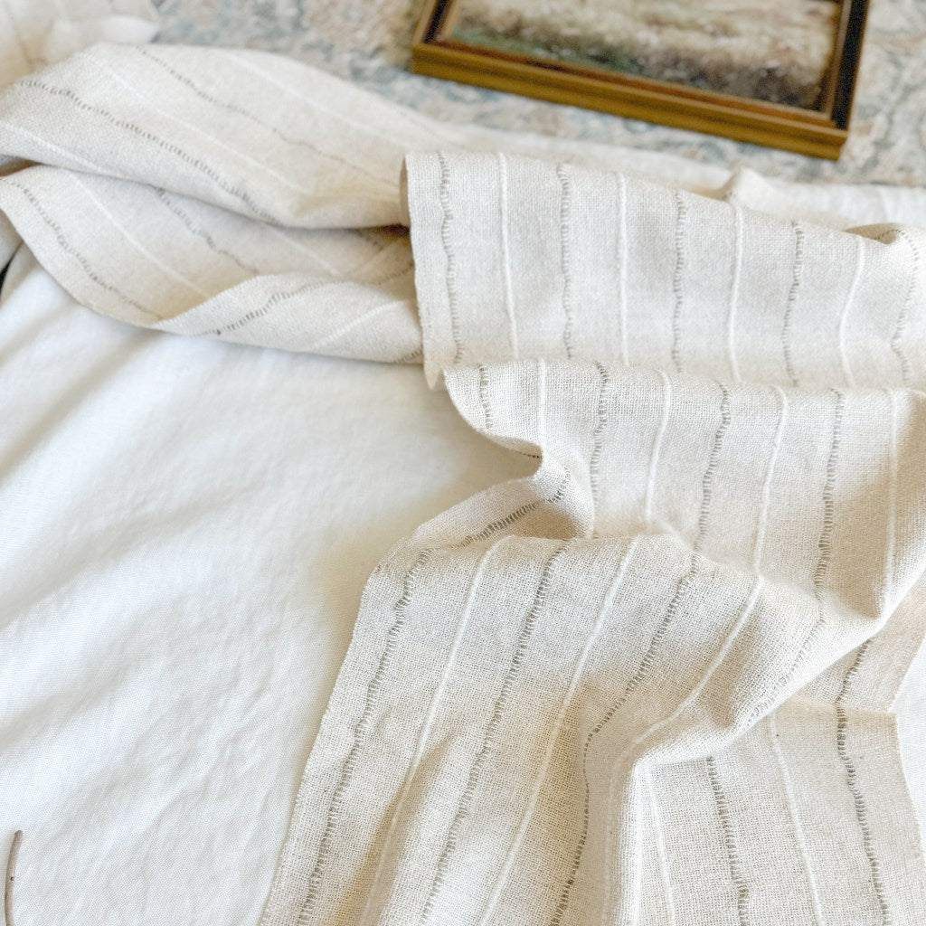 Featuring a creamy ivory cotton yard hand-crafted on a traditional wooden loom, we love the delicate texture that gives this fabric character. Made using all natural cotton, it is a bit of modern, a bit of boho and loads of warmth. We’re dreaming of these for farmhouse style spaces filled with light and greenery.