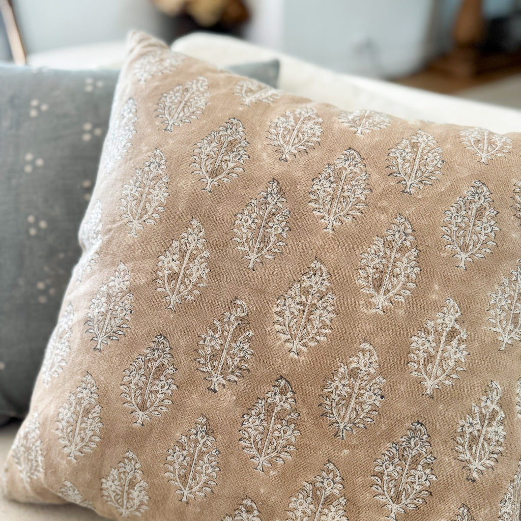 Featuring a delicate floral motif pattern hand block printed using traditional printing techniques, we love the soft color and texture that gives this fabric so much character. Made using incredibly soft linen, it is a bit of modern, a bit of boho, and loads of warmth. We’re dreaming of these for farmhouse-style spaces filled with light and greenery.