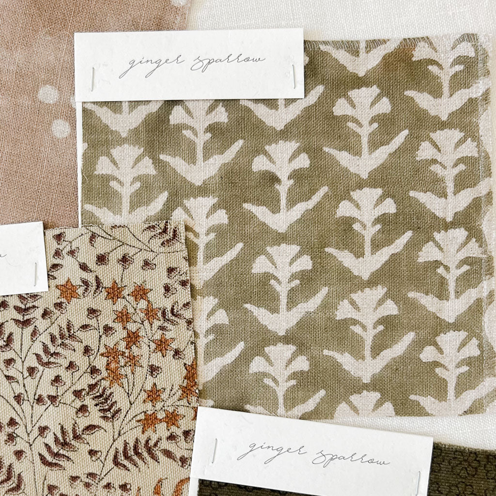 Featuring a delicate floral motif pattern hand block printed using traditional printing techniques, we love the soft color and texture that gives this fabric so much character. Made using incredibly soft linen, it is a bit of modern, a bit of boho, and loads of warmth. We’re dreaming of these for farmhouse-style spaces filled with light and greenery.